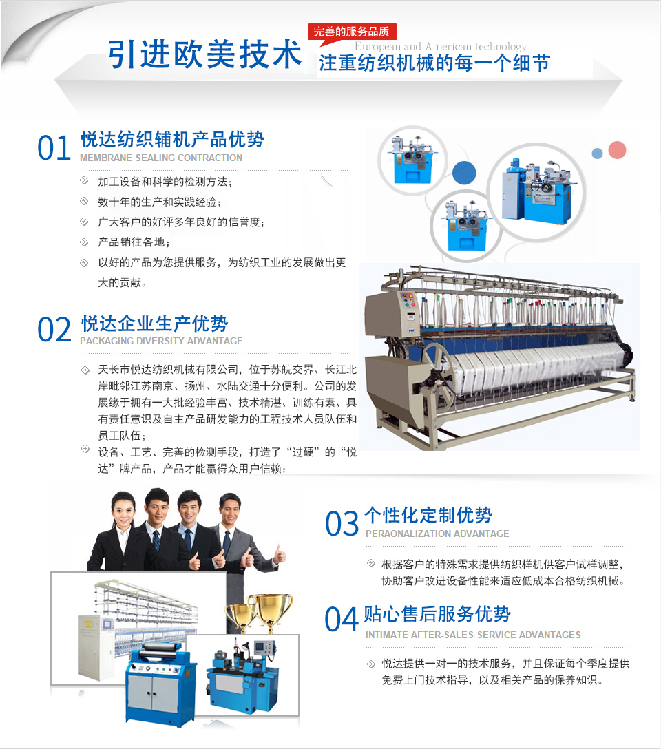 公司是主要生產(chǎn)紡織平車(chē)安裝工具、紡部輔件及配件綜合性企業(yè)。已有二十多年的生產(chǎn)歷史,在激烈的市場(chǎng)競(jìng)爭(zhēng)中始終保持優(yōu)良的質(zhì)量、優(yōu)化的價(jià)格、齊全的品種優(yōu)勢(shì)。產(chǎn)品暢銷(xiāo)全國(guó)各地,深受新老客戶(hù)的好評(píng)。